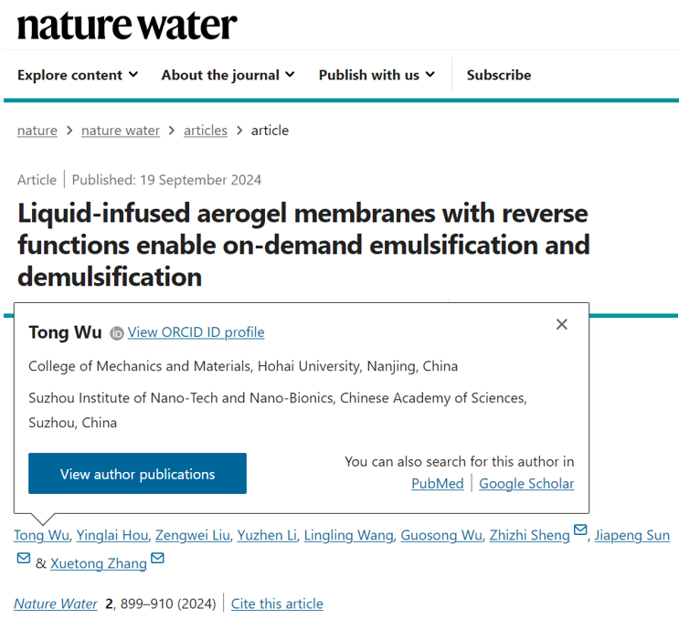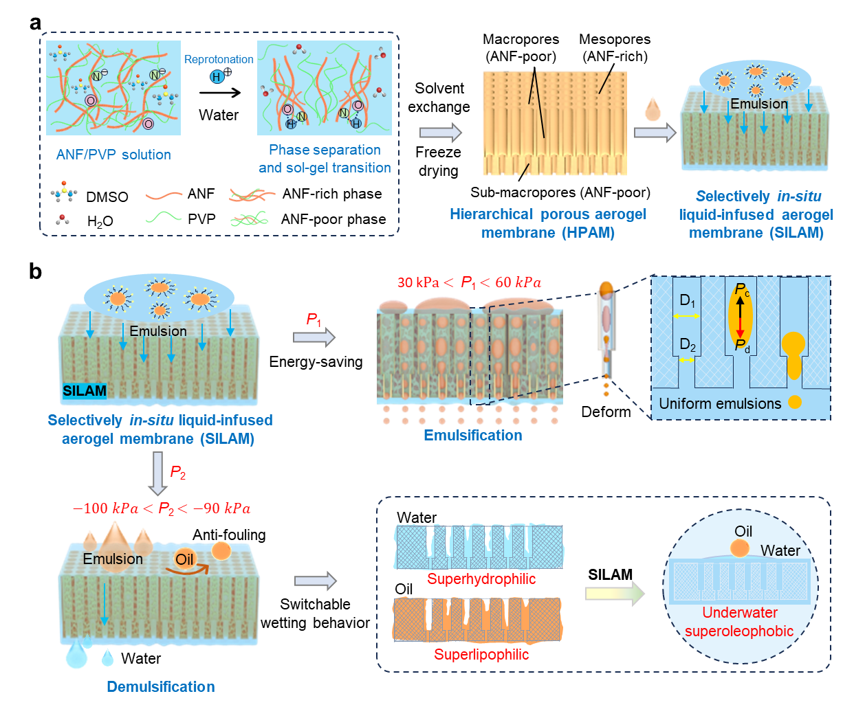 近日,好色视频 材料与化工专业硕士研究生吴桐以第一作者身份在国际期刊《Nature Water》上发表了题为“Liquid-infused aerogel membrane with reverse functions enables on-demand emulsification and demulsification”的研究性论文。中国科好色视频 苏州纳米技术与纳米仿生研究所张学同研究员、盛智芝副研究员和好色视频 孙甲鹏副研究员为论文通讯作者。好色视频 硕士研究生王玲玲和吴国松教授为论文的共同作者。