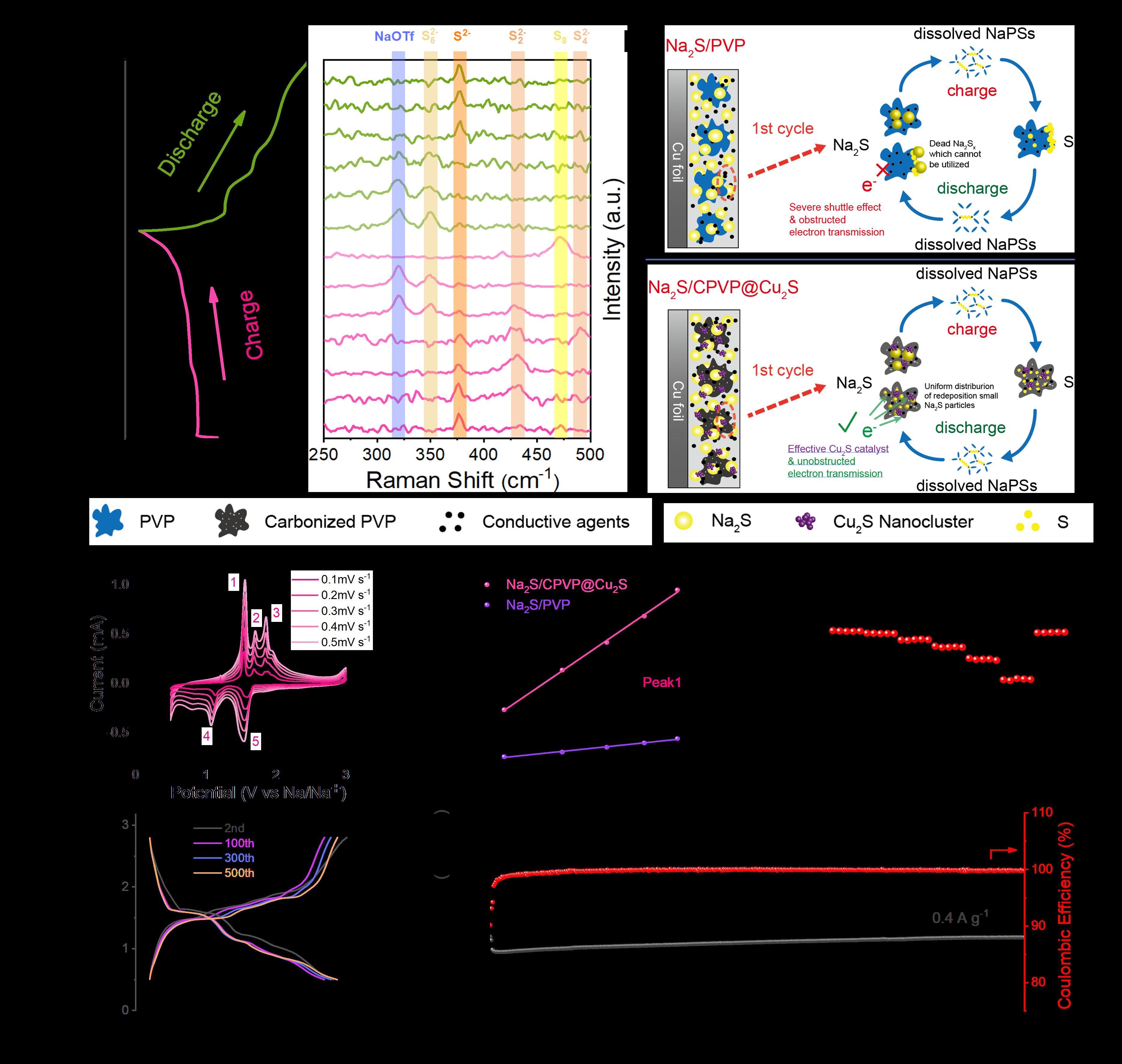 苏州纳米所吴晓东研究员合作:通过调节硫化钠的再沉积行为,巧妙地设计了一个有前途的Na2S/CPVP@Cu2S一体化阴极。热处理高温促进聚乙烯吡咯烷酮(PVP)碳化成包裹硫化钠颗粒的连续导电基体,铜集流体表面的氧化层与硫化钠发生原位反应,生成硫化亚铜催化剂。得益于一体化阴极的协同作用,微米级硫化钠颗粒在初始循环过程中通过固-液-固转化迅速自细化为纳米级硫化钠颗粒,且在后续循环过程中尺寸保持稳定。由于快速的转化动力学有效地抑制了穿梭效应,所制备的Na2S/CPVP@Cu2S表现出优异的循环稳定性和倍率性能。本工作实现了源自工业废弃物的硫化钠的稳定循环,为室温钠硫电池无钠阳极体系的研究和实际应用提供了重要参考。