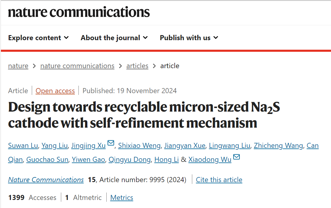 许晶晶研究员以共同通讯作者身份在国际知名期刊《Nature Communications》上发表了题为“Design towards recyclable micron-sized Na2S cathode with self-refinement mechanism”的研究性论文。中国科好色视频