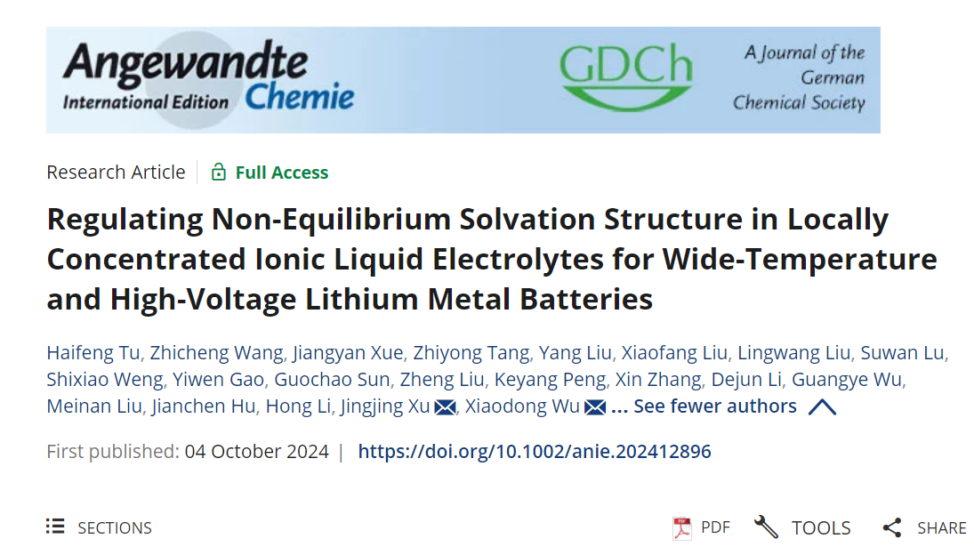 许晶晶研究员以共同通讯作者身份在国际知名期刊《Angwandte Chemie International Edition》(德国应用化学)上发表了题为“Regulating Non-Equilibrium Solvation Structure in Locally Concentrated Ionic Liquid Electrolytes for Wide-Temperature and High-Voltage Lithium Metal Batteries”的研究性论文。中国科好色视频