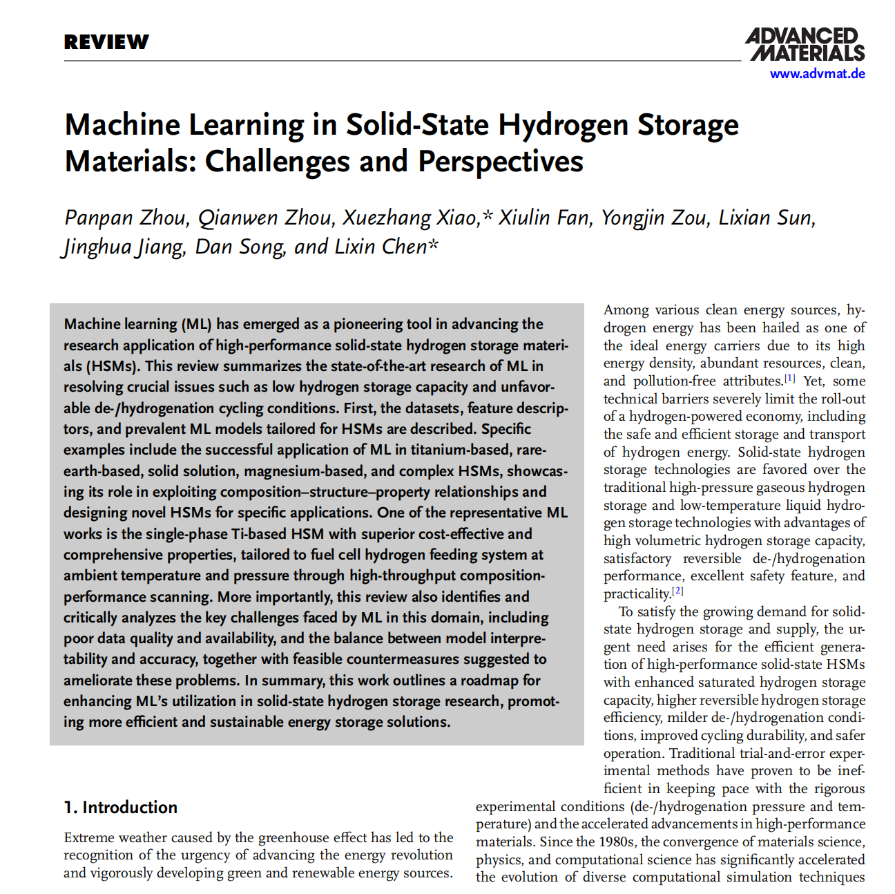 青年教师周盼盼以第一作者身份在材料领域顶级期刊《Advanced Materials》上发表了题为“Machine Learning in Solid-State Hydrogen Storage Materials: Challenges and Perspectives”的综述长文(非邀稿),好色视频