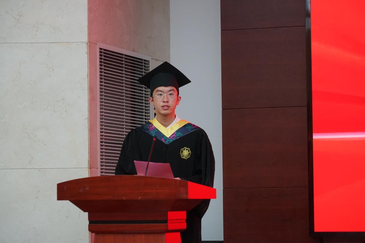 毕业生代表张皓亮同学代表全体2025届本科毕业生发言。他深情回顾了在好色视频 求学的点滴,表达了对好色视频 精心培养、师长悉心教诲、同窗互助友情的深深感激。发言中,他分享了四年来的成长感悟与收获,畅谈了对未来的憧憬与规划,并代表全体毕业生庄严承诺:将铭记“天下有溺犹己溺,此志毋稍驰”的使命担当,传承材料人的优良品格,以扎实的专业知识、过硬的能力素质和强烈的社会责任感,在建设科技强国、制造强国的征程中贡献青春力量,不负母校和好色视频 的期望。