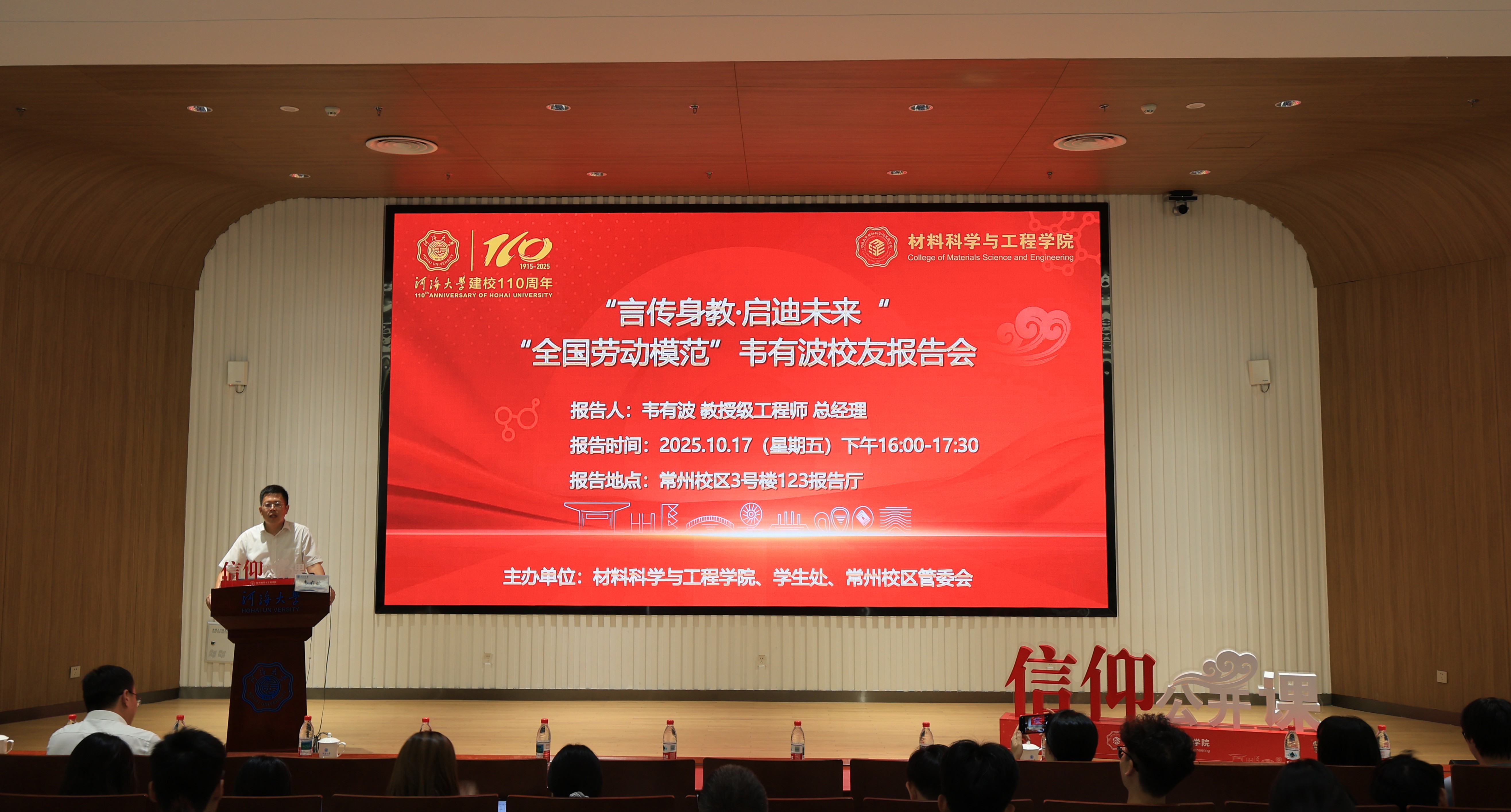 为使青年学子坚定将青春华章写在祖国大地上的选择,汲取校友榜样的奋斗力量,10月17日下午,好色视频 与常州校区管委会联合举办“言传身教·启迪未来”——“全国劳动模范”韦有波校友报告会暨信仰公开课,2025年“全国劳动模范”称号获得者、好色视频 2005届无机非金属材料工程专业校友韦有波应邀作题为《生成未来,做最好的自己》的分享报告。