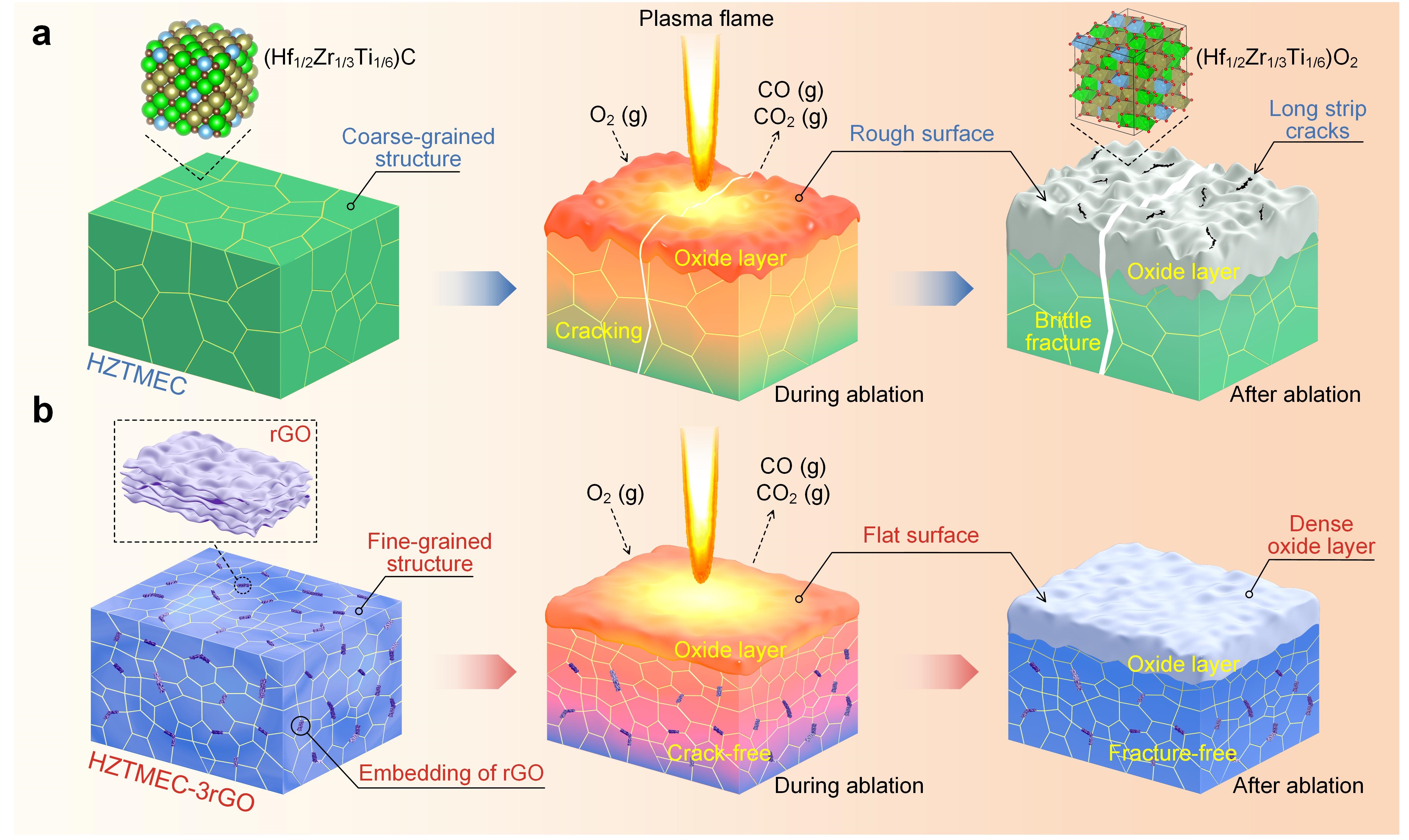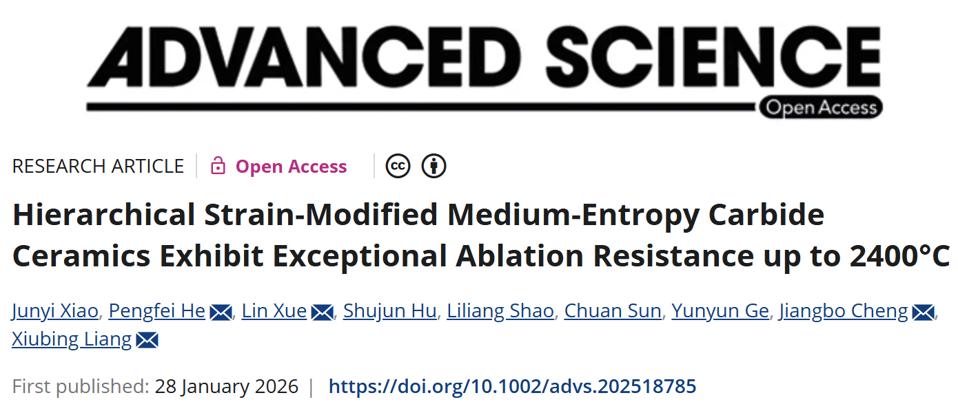 新材料与智能制造科研团队在国际高影响力学术期刊《Advanced Science》发表题为“Hierarchical Strain-Modified Medium-Entropy Carbide Ceramics Exhibit Exceptional Ablation Resistance up to 2400 °C(分级应变调控中熵碳化物陶瓷在2400℃下展现优异抗烧蚀性能)”的研究论文。该研究在中熵(HfZrTi)C陶瓷中引入还原氧化石墨烯作为增韧相与烧蚀牺牲相,实现了跨尺度应变调控。该策略使材料在2400 ℃等离子热流冲击下保持结构完整、无宏观开裂,同时显著降低质量烧蚀率和线烧蚀率,表现出优异抗烧蚀性能,为高速飞行器热防护材料“耐高温-抗热震-抗氧化”一体化设计提供了新思路。