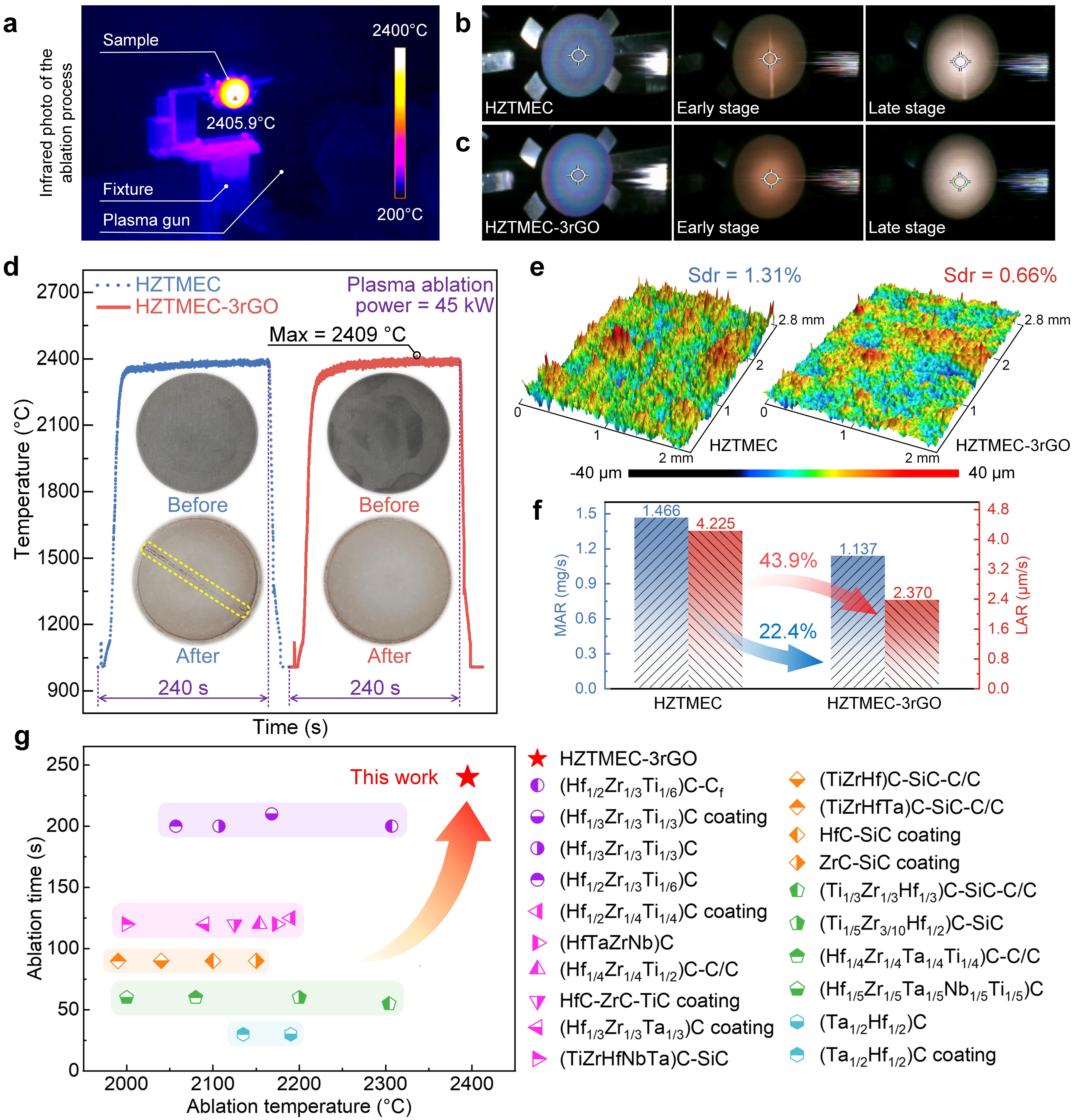 针对上述挑战,研究团队提出一种分级应变调控策略,在(HfZrTi)C中熵陶瓷中引入还原氧化石墨烯(rGO),利用rGO作为多功能相,同时发挥增韧相和牺牲相的作用,实现了微观与介观跨尺度应变协同调控。在微观尺度,rGO掺杂显著增强了原子应变,平均晶粒尺寸从16.41 µm细化至12.17 µm,扩展了高应变区域,增加了位错密度并阻碍位错运动,断裂韧性提升至7.51 MPa·m1/2;在介观尺度,rGO在烧蚀过程中氧化挥发,在氧化层内形成微孔,这些微孔有效耗散了烧蚀产生的相变应力和热应力。实验结果表明,所研发的新材料在2400 °C等离子烧蚀240秒后仍保持结构完整,形成了致密平整的氧化层,质量烧蚀率和线烧蚀率相比未掺杂样品分别显著降低22.4%和43.9%。这一分级应变调控策略兼顾超高温陶瓷抗烧蚀性能与结构稳定性,实现了“热-力-氧”耦合严苛烧蚀环境下的可靠服役,为开发先进热防护陶瓷材料提供了创新解决方案,有望推动其在极端热环境中的广泛应用。